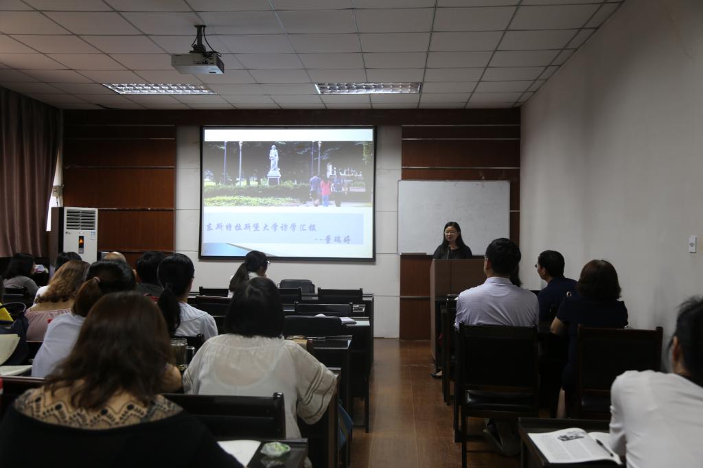 董瑞婷老师则从“教与学”和“学术与科研”两个角度分享了自己的所感所思,尤其是如何把访学所得运用到自己平时的教学和科研中,引发了在座老师们的深刻思考。