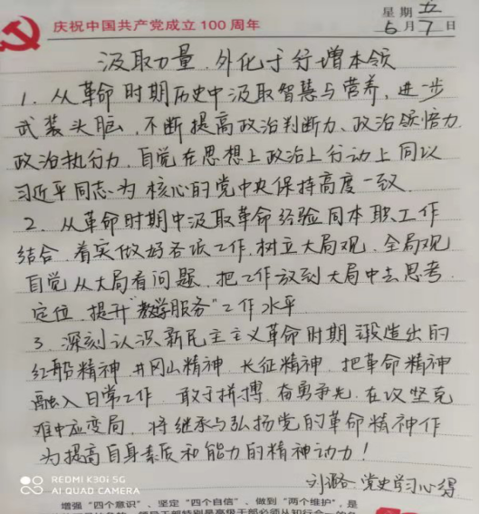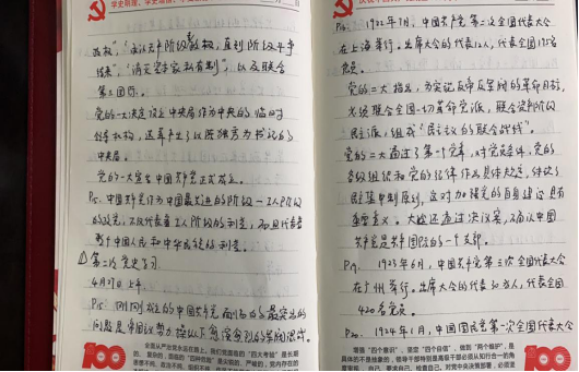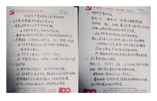 党史学习教育开展之初,外语部党总支便为全体党员提供了习近平总书记《论中国共产党历史》《毛泽东、邓小平、江泽民、胡锦涛关于中国共产党历史论述摘编》《习近平新时代中国特色社会主义思想学习问答》《简明河南党史》等学习材料,确保党员学习材料全覆盖。外语部党员同志以积极的态度与饱满的热情投入党史学习教育,学习氛围浓厚,接下来让我们一起看一看他们的学习笔记和心得。