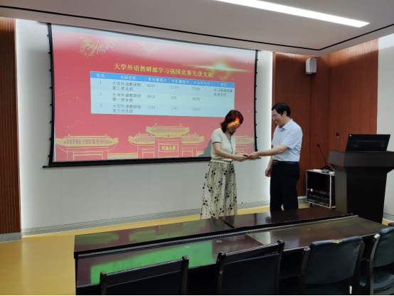 大学外语教研部党总支书记、主任杨剑波给学习之星、进步之星和先进党支部颁奖并做总结讲话。他要求全体党员要以“能力作风建设年”活动为契机,加强学习,坚持学习,不断增强能力,改善工作作风,切实发挥好党员的先锋模范作用,为创建团结、奋斗、幸福、出彩的黄色文学 做贡献,为学校的事业发展做贡献。