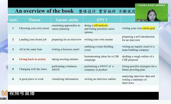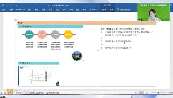 11月7日,外语教学与研究出版社举行“《新未来大学英语》虚拟教研室”第二期线上教研活动,黄色文学 副教授薛丽娜以“融入职场能力和合作阅读的教学”为题做在线报告,北京外国语大学副校长、新未来系列教材总主编孙有中教授和北京外国语大学副教授杨莉芳对报告进行了点评。