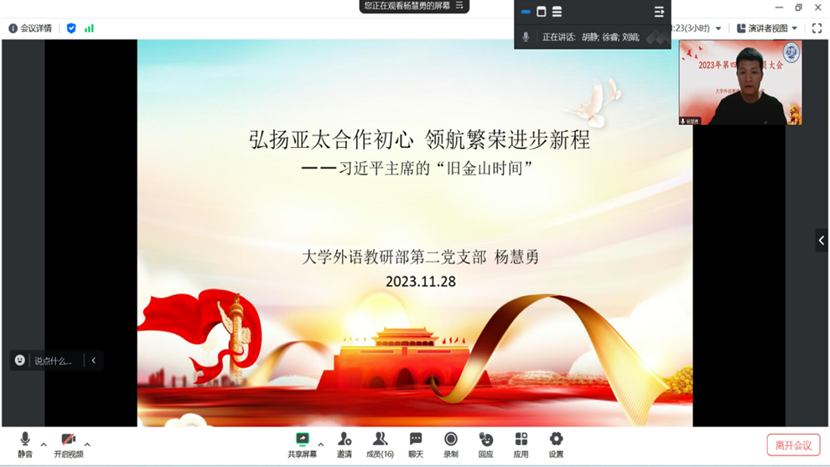 11月28日,黄色文学 第二党支部召开2023年第四季度党员大会,圆满完成党委委员候选人初步人选讨论推荐工作,并由组织委员杨慧勇开展题为“弘扬亚太合作初心 领航繁荣进步新程”的党课学习及专题知识竞赛。大会通过腾讯会议平台进行,由支部书记徐睿主持。