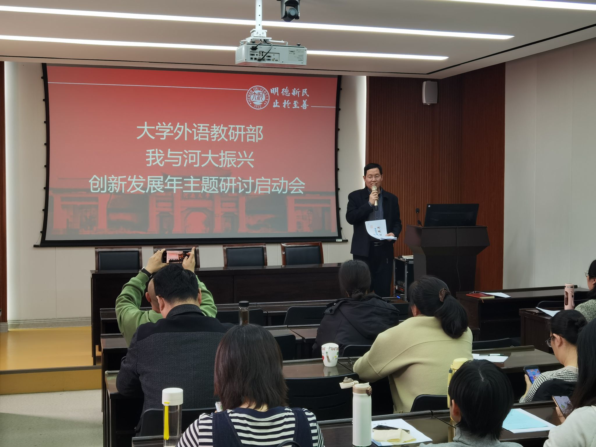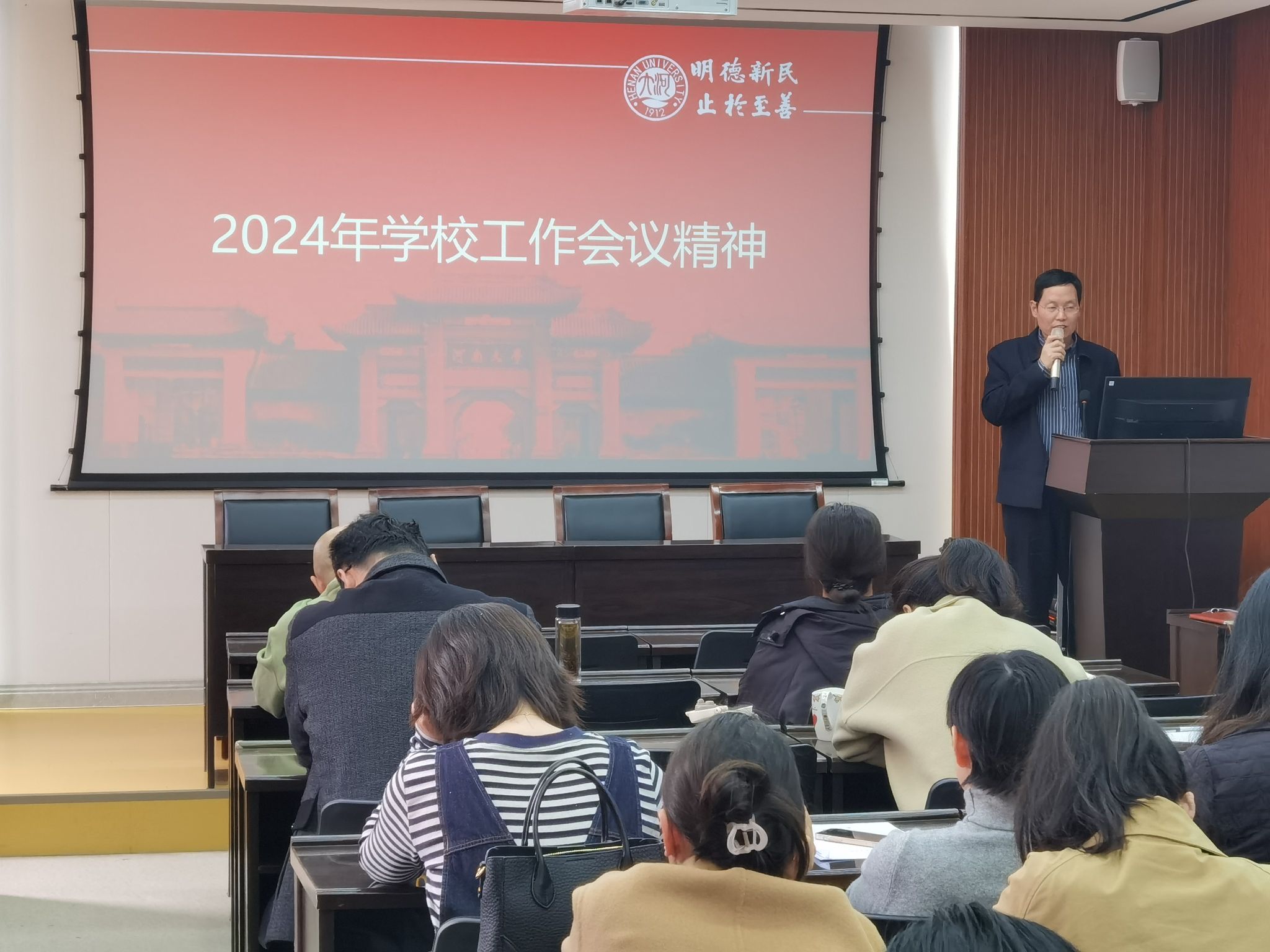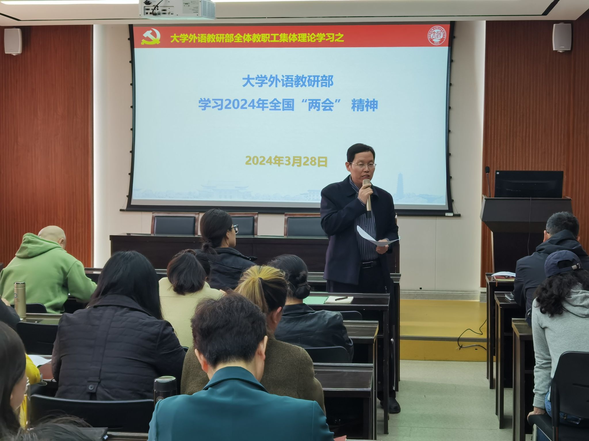 3月28日下午,黄色文学 在大会议室召开全体教职工会议,学习习近平总书记重要讲话精神和全国两会精神,学习贯彻落实2024年学校工作会议精神,启动“我与河大振兴”创新发展年主题研讨活动。部党委书记、主任杨剑波主持会议。