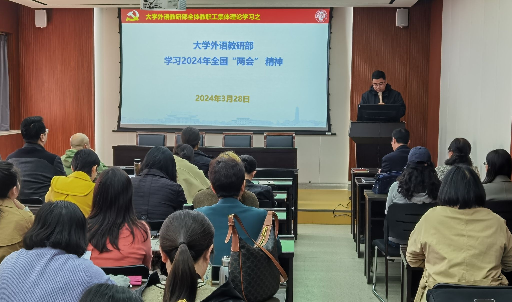 会议共分为三部分,按既定议程,首先由部党委副书记、副主任蒋框领学习近平总书记重要讲话精神和全国两会精神。蒋框为全体教师解读了会议概况、习近平总书记在全国两会期间重要讲话精神,结合大学英语教学梳理了什么是新质生产力、为什么强调新质生产力、怎样发展新质生产力。