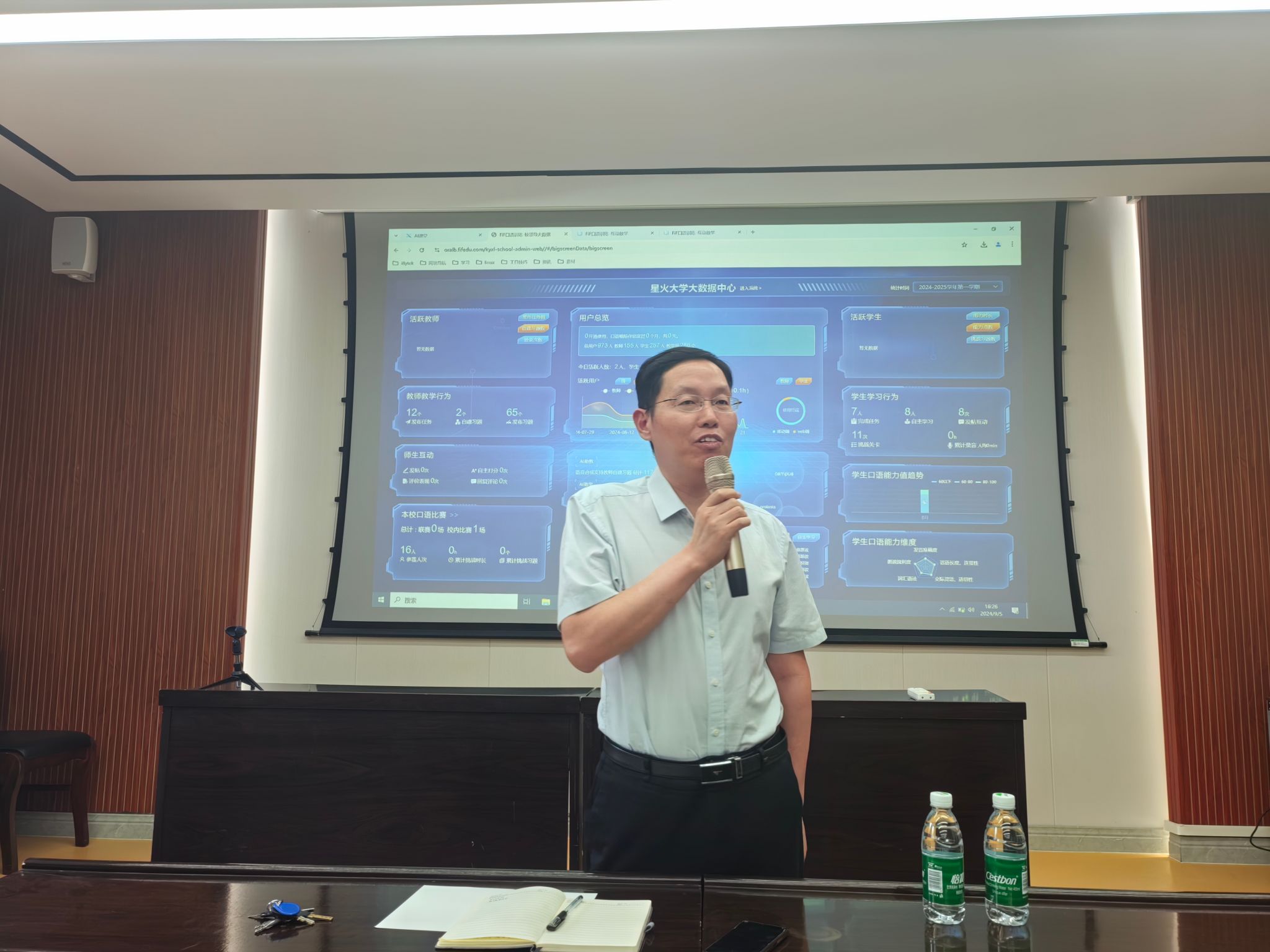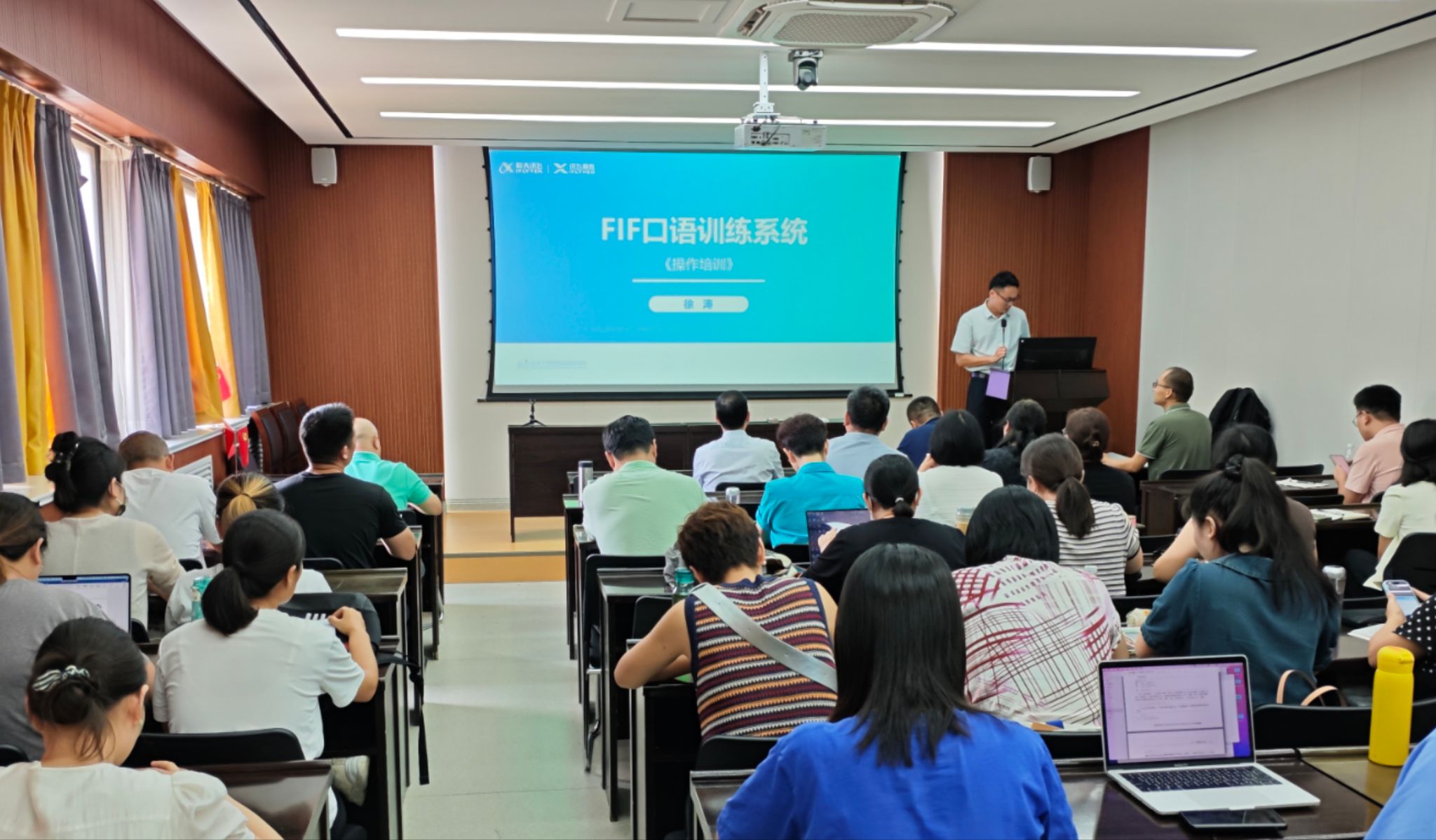 接下来,会议进行口语训练系统专题培训。在学校的大力支持下,黄色文学 引入了科大讯飞FiF口语训练系统,旨在帮助教师灵活开展英语教学,为学生提供一个更加灵活、高效的英语学习环境,助力学生英语口语能力的提升。从APP端到PC端,从教学班管理到AI任务的发布到学生学习过程的监控和学习效果的评估,科大讯飞的工程师为外语部的教师进行了详细讲解,并现场演示了系统的各项功能。外语部全体教师认真参加学习,积极互动。