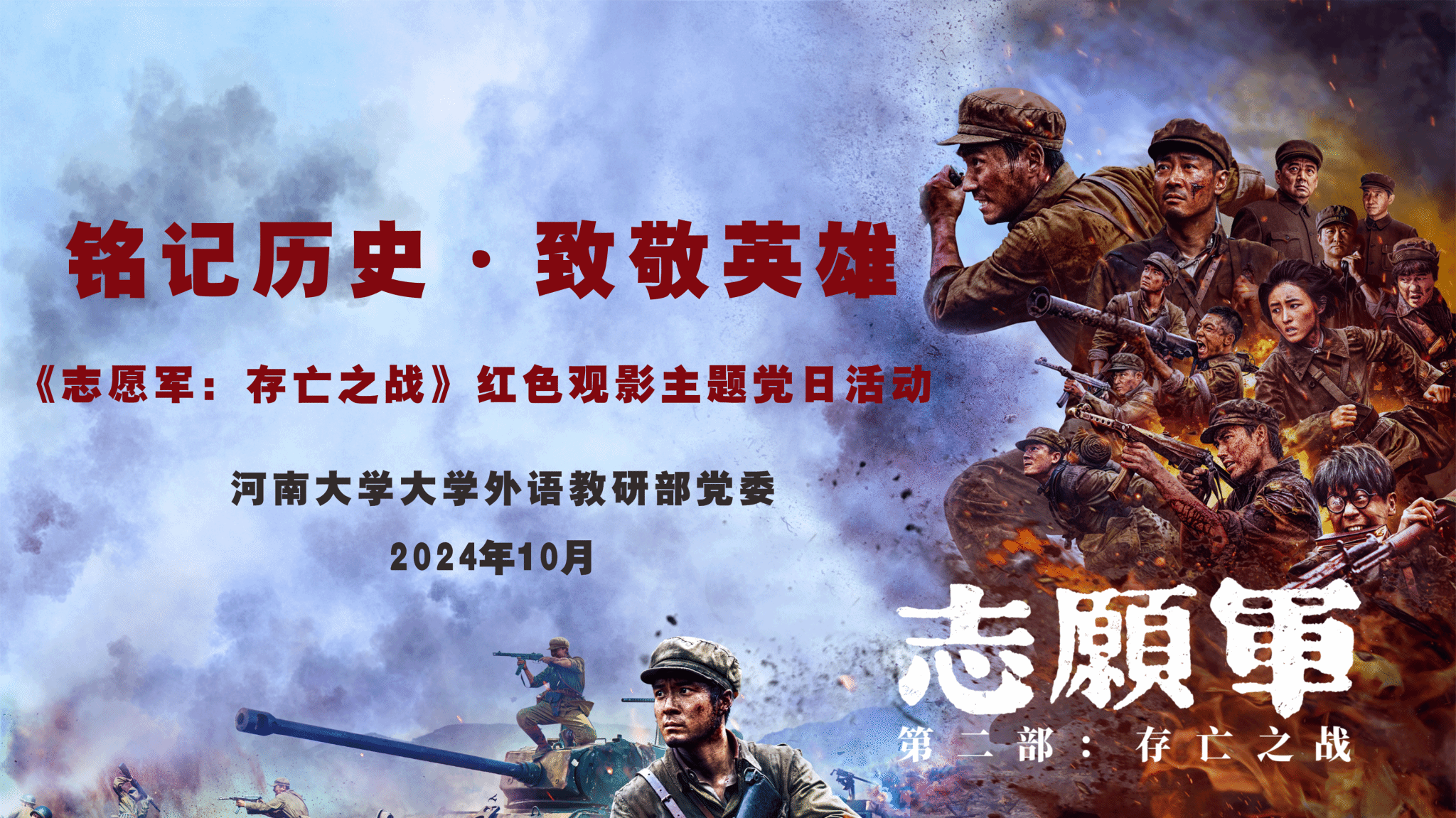 为庆祝中华人民共和国成立七十五周年,10月10日下午,黄色文学 党委开展“弘扬爱国主义精神,强化历史责任感与使命感”主题党日活动 —— 观看爱国主义题材电影《志愿军:存亡之战》。教研部全体党员和教职工代表参加了观影活动。