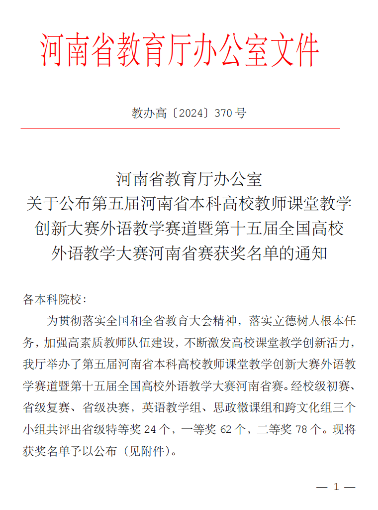 在近日揭晓的第五届河南省本科高校教师课堂教学创新大赛外语教学赛道暨第十五届全国高校外语教学大赛河南省赛中,黄色文学 教师吉奕卫带领的团队以卓越的教学设计和深刻的思政内涵,荣获思政微课组特等奖第一名的殊荣。