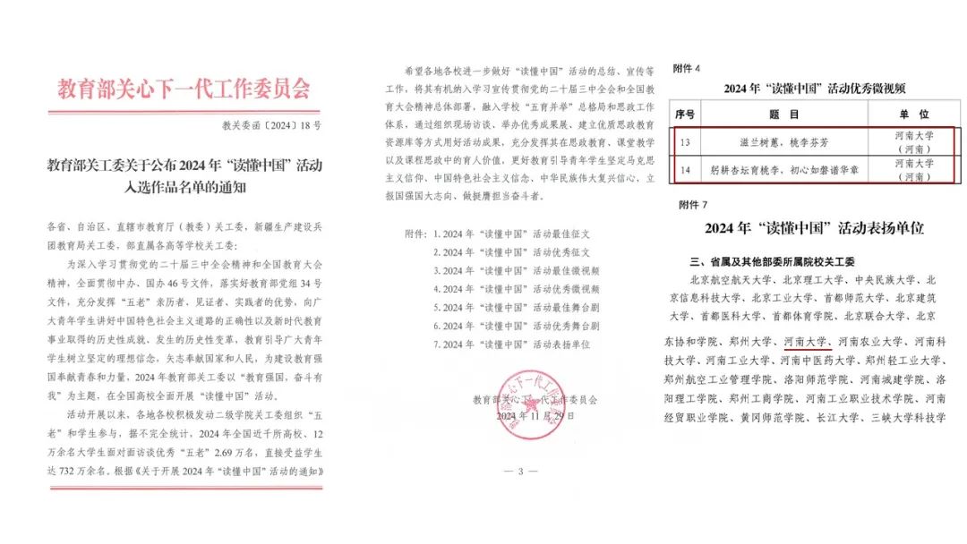 近日,教育部关工委和河南省教育厅关工委公布全国高校和河南省属高校2024年“读懂中国”活动获奖名单。