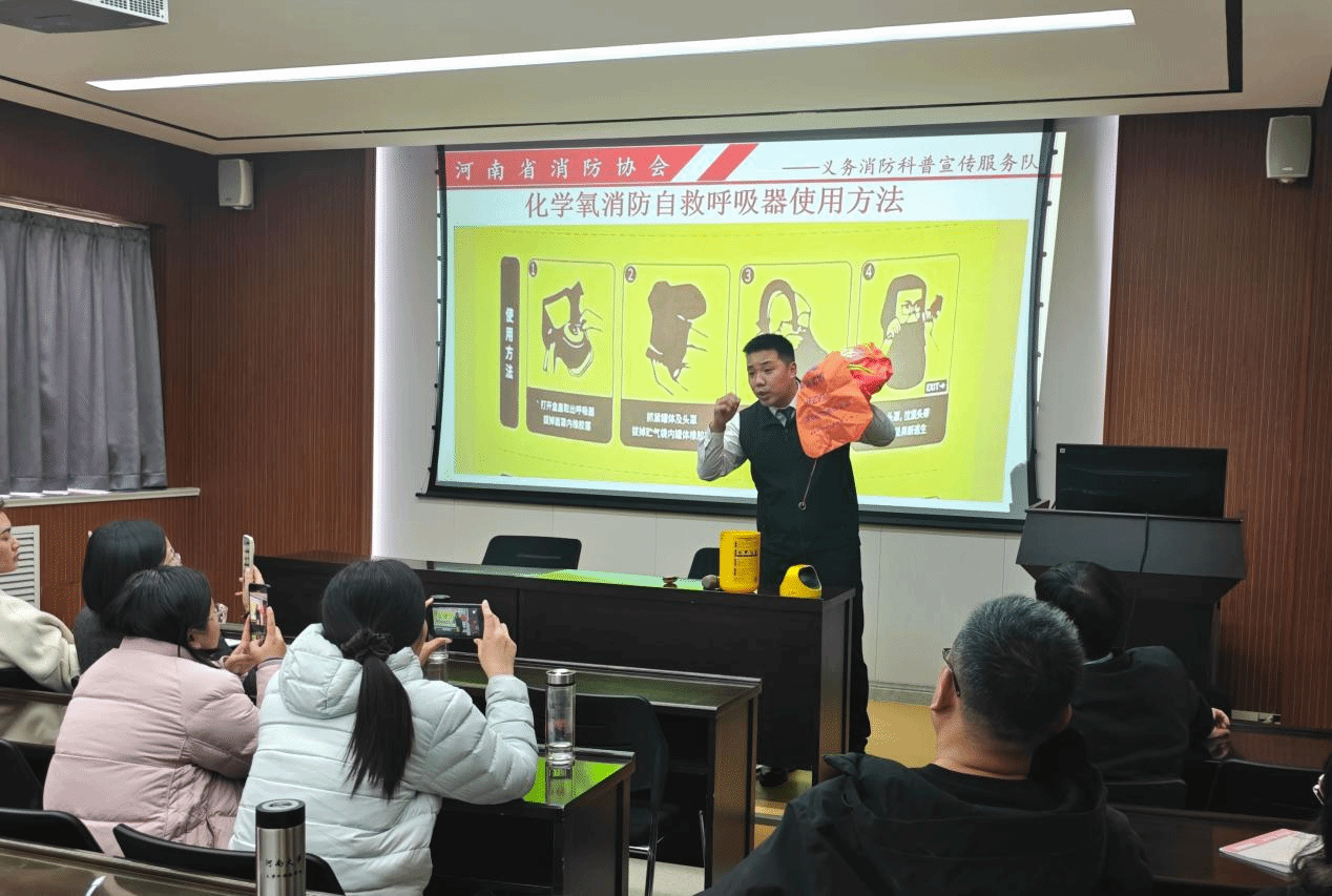实操环节,王胜强现场演示化学氧消防自救呼吸器使用步骤,从取器、佩戴头罩到系紧系带、启动供气装置,逐一细化讲解。此外,他还详解防火贴的功能与粘贴要点,以及水基灭火器的适用场景、操作规范和维护注意事项,确保教职工熟练掌握消防器材使用方法。