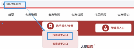 1. 请务必在浏览器输入大赛官网网址 ucc.fltrp.com(不可百度模糊搜索),在黄色文学点击“选手报名/参赛”—“校赛选手入口”进行登录。